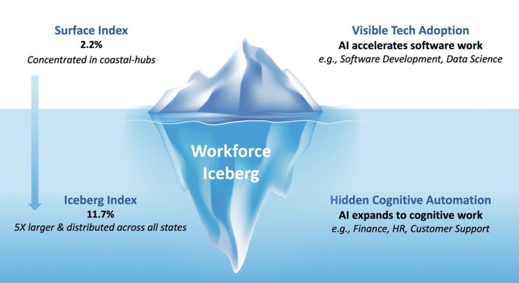 MIT’s researchers draw a deliberate visual distinction. The tech sector layoffs that dominate headlines represent just 2.2% of total wage exposure. This is the visible tip of the iceberg. The submerged mass lies elsewhere: routine functions in human resources, logistics, finance, and office administration. These roles rarely make news when they disappear. They simply stop being filled.