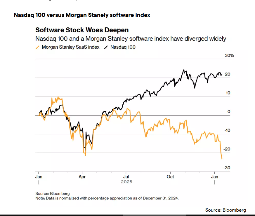 While the Nasdaq 100 gained roughly 20% through 2025, the Morgan Stanley SaaS Index fell by nearly the same amount, a gap that has only widened so far in 2026.