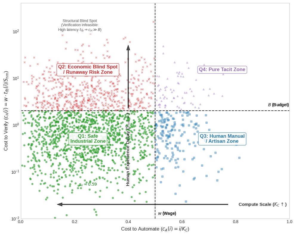 This creates four quadrants. Q1, the Safe Industrial Zone, covers work that’s cheap to automate and cheap to check: data entry, basic coding, routine financial processing. Q2, the Runaway Risk Zone, is where things get interesting: work AI can do cheaply but that’s expensive for humans to verify properly, like legal drafting, medical diagnosis, or complex software development. Q3, the Artisan Zone, captures work that’s hard to automate but easy to verify: plumbing, electrical work, physiotherapy. And Q4, the Pure Tacit Zone, covers work that’s both hard to automate and hard to verify: leadership, novel research, complex negotiation.