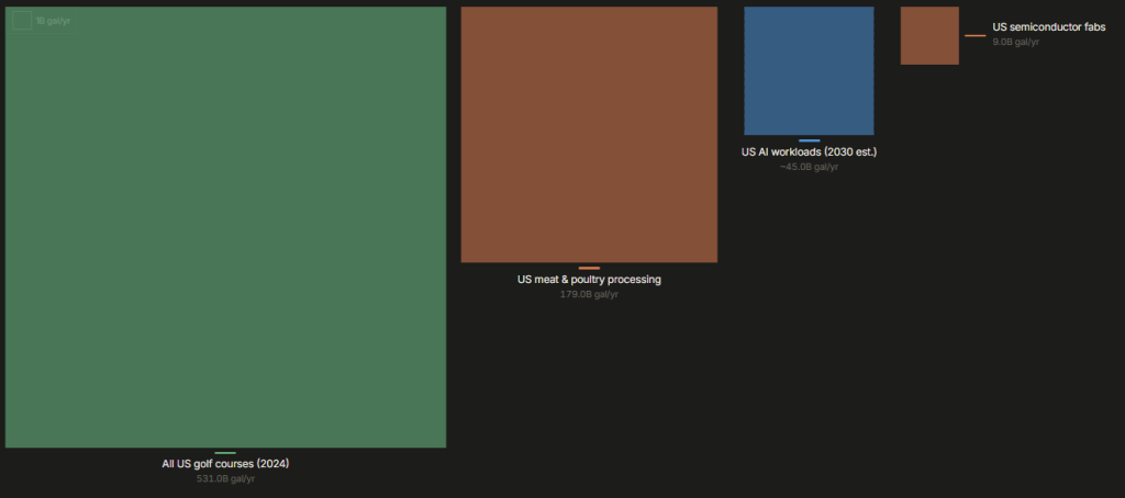 The chart this week comes from Andy Masley, a researcher who has spent the past year challenging claims about AI’s environmental footprint. His interactive visualisation compares US water consumption across industries using public supply (potable) water. US meat and poultry processing consumes 108 billion gallons per year. All US golf courses drink 48 billion. Semiconductor fabs use 9 billion. And all US AI workloads? And all US AI workloads projected to use 45 billion by 2030.