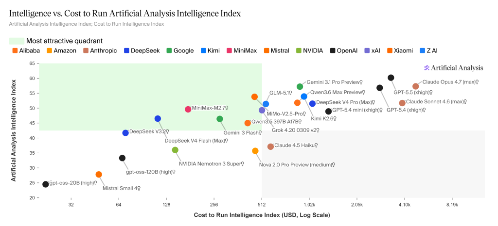 Artificial Analysis’s latest chart (25 April) maps the trade-off precisely. GPT-5.5 (xhigh) sits at the highest point on the intelligence axis, but also the furthest right on cost. DeepSeek V4 Pro is in the same upper intelligence band but considerably cheaper, while DeepSeek V4 Flash drops into the “most attractive quadrant” alongside Gemini 3 Flash, MiniMax-M2.7 and GLM-5.1 — capable intelligence at a fraction of the cost.