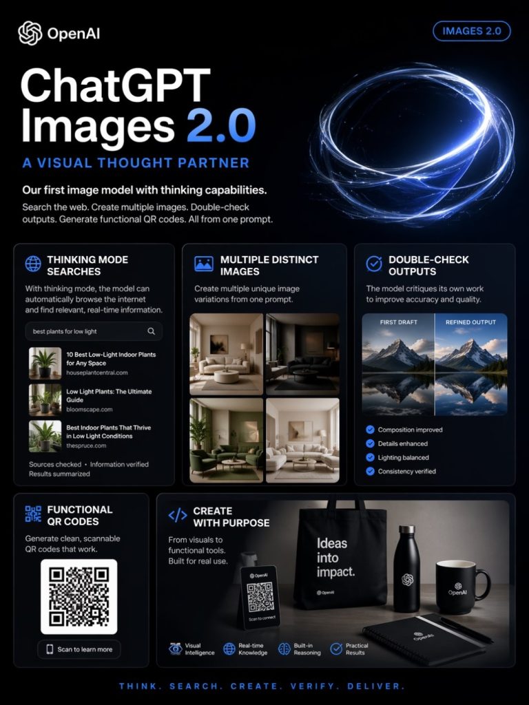 OpenAI released ChatGPT Images 2.0 this week, and the launch poster is worth a close look. In a single generated frame it carries a working QR code, sharp multilingual headlines, and a detailed product still life with consistent lighting across a row of branded objects. Four years ago a diffusion model could barely spell a shop sign. Today one prompt produces a scannable code, readable typography, and a self-critique step where the model checks its own draft before handing the file over. That is a dramatic improvement, and it is worth asking how it happened.